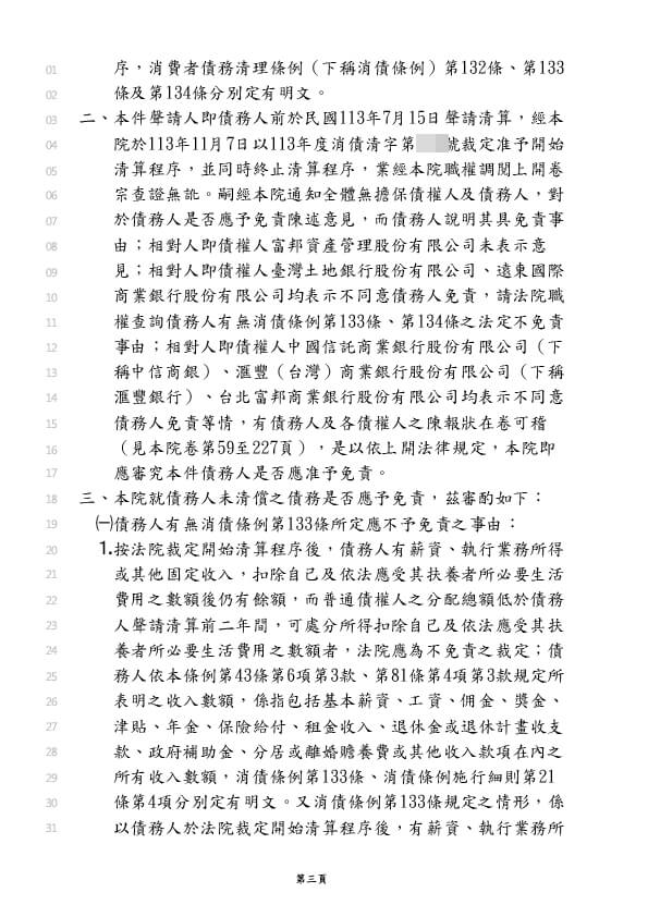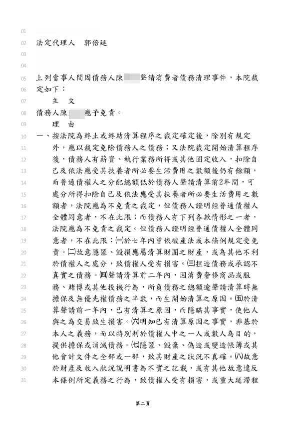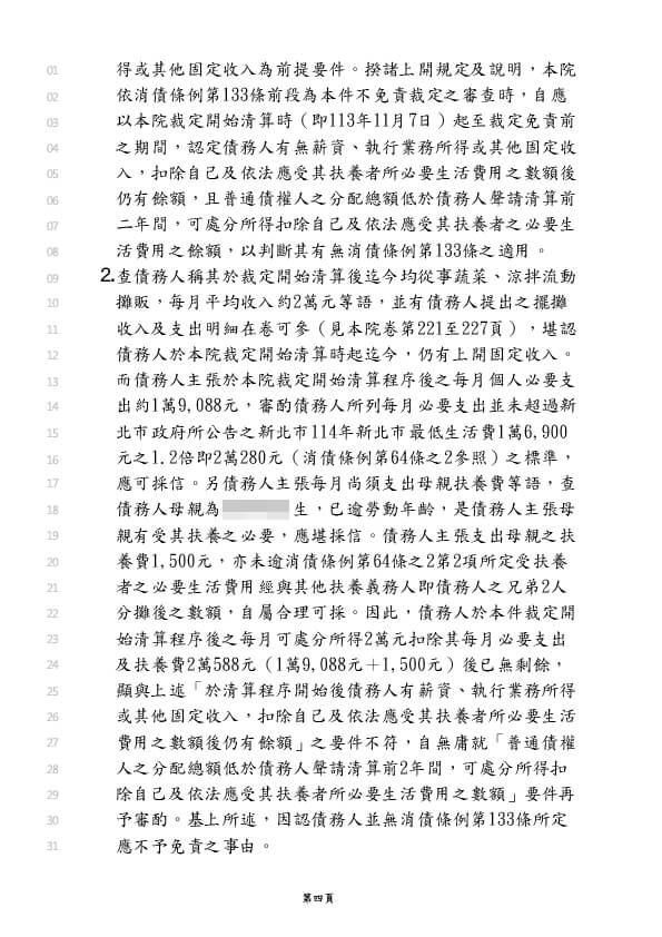 債務人陳先生,早期因收入不穩定,又誤信他人替人擔保導致原先經營的企業社房産都沒了,逕而造成今日債務無法償還之情事。陳先生依據消費者債務清理條例向新北地方法院聲請清算程序,新北地方法院依據其總債務超過12,000,000元,111年8月至113年7月收入總額為480,000元;債務人111年8月至113年7月生活必要支出及扶養費為494,112元,債務人清算前二年間可處分所得為0元,法院審查後無其它不免責事由,法院於114年裁定予以免責。