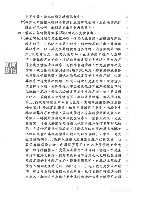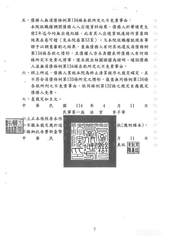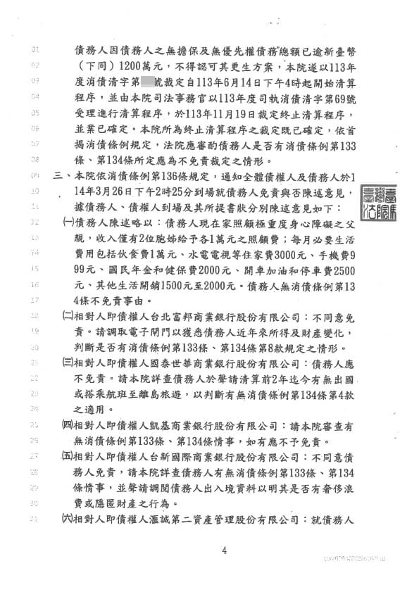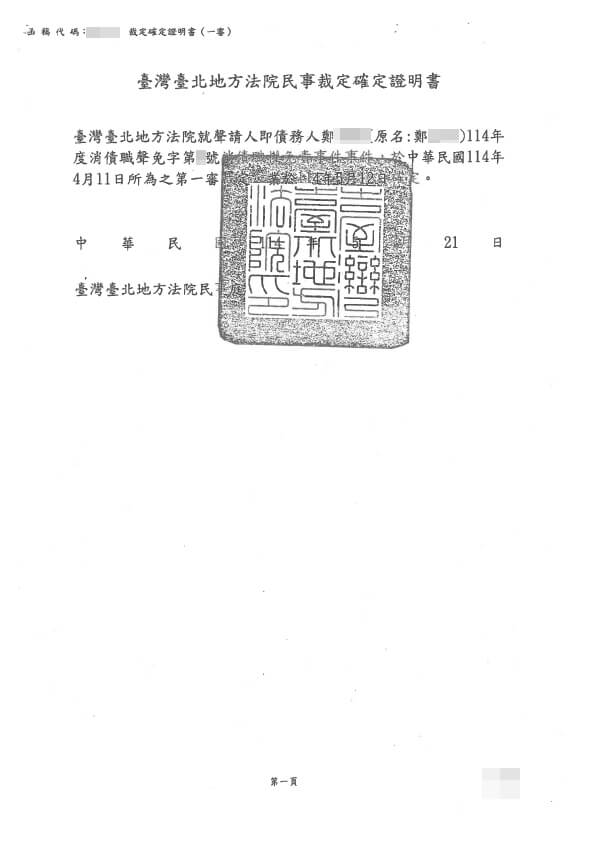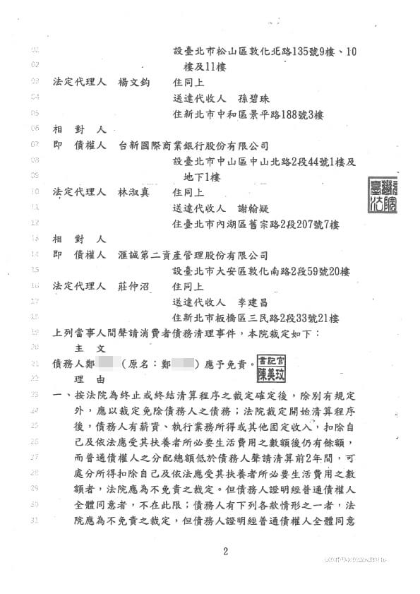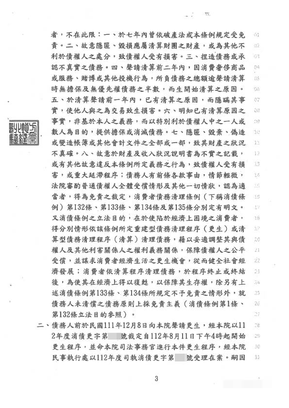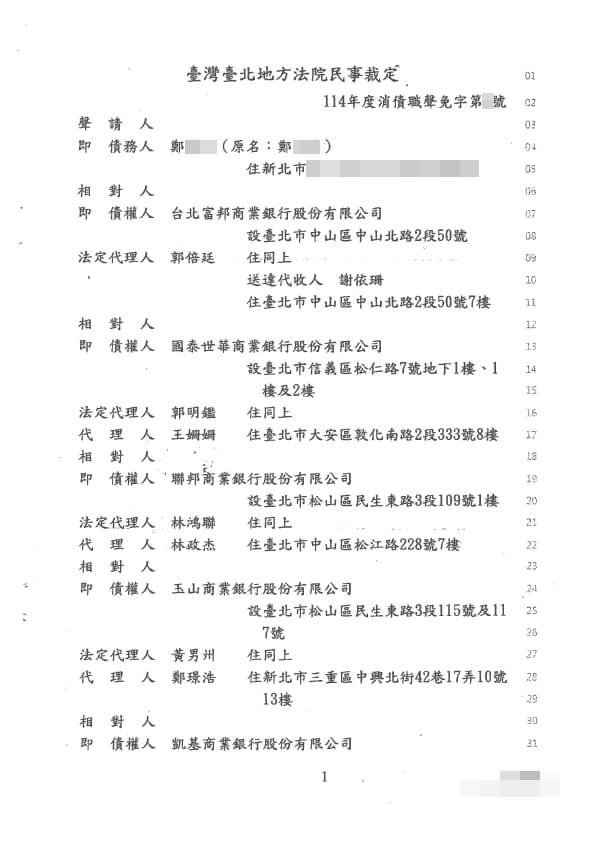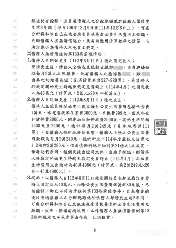 鄭先生,53歲,早年因進口日本商品要做買賣投資,不幸遇上景氣不好經濟崩盤,而欠下債務,原本工作是司機,但遇上疫情和母親離世,需獨自照顧罹患心臟病及長期洗腎的年邁父親,無法正常工作,目前收入是每月姐姐給的照顧費2萬元,實在無力處理累積高達12,734,065元,故債務人依據消費者債務清理條例向臺灣臺北地方法院聲請清算程序,臺北地院依據其收入及生活必要支出費用,因收入有限且需照顧年邁父親,每月所剩無幾甚至入不敷出,亦無財產可做分配,最後裁定清算免責,並已復權確定。