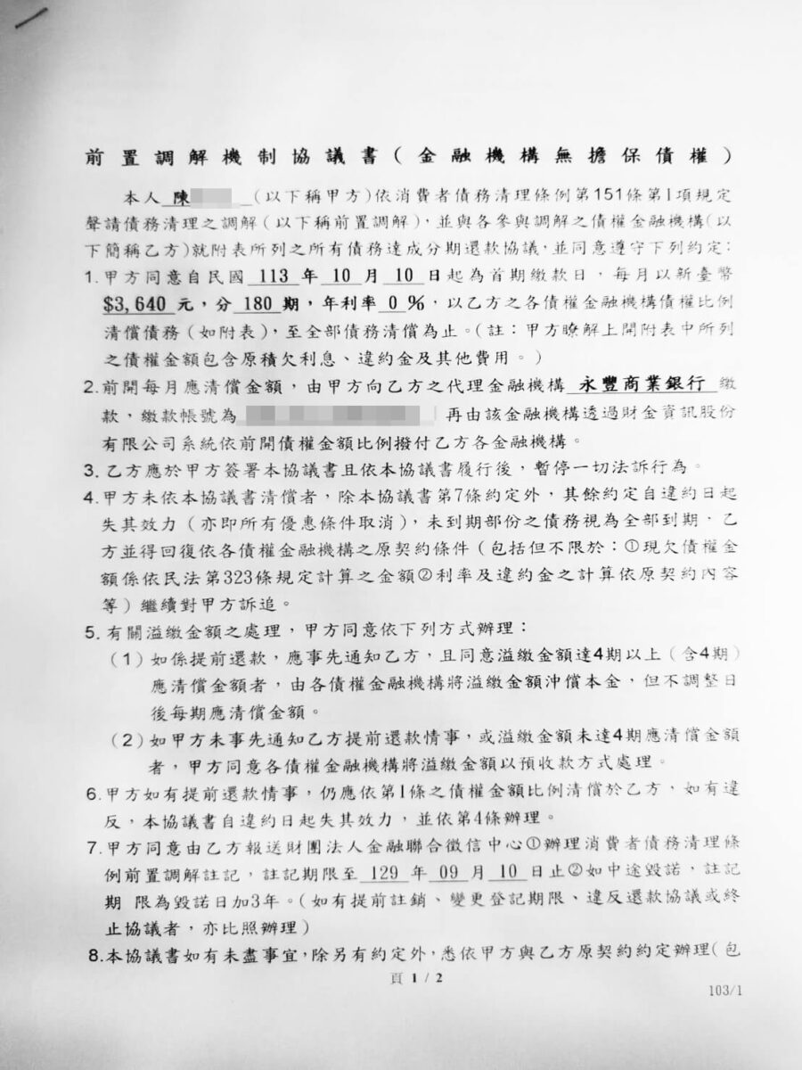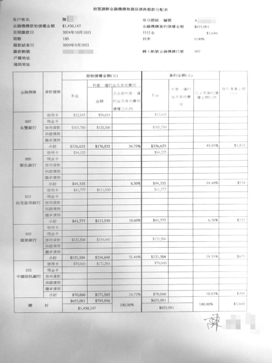 陳先生,現年44歲,職業為廚師,平均月薪為新台幣3.8萬元,總債務為新台幣1450147元,經鼎翰專業團隊協助處理後,協商方案為每1個月為一期,分180期清償,利率為0%,每期清償金額為新台幣3640元。