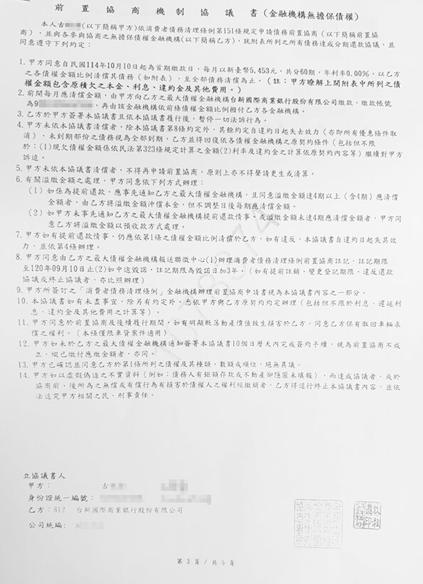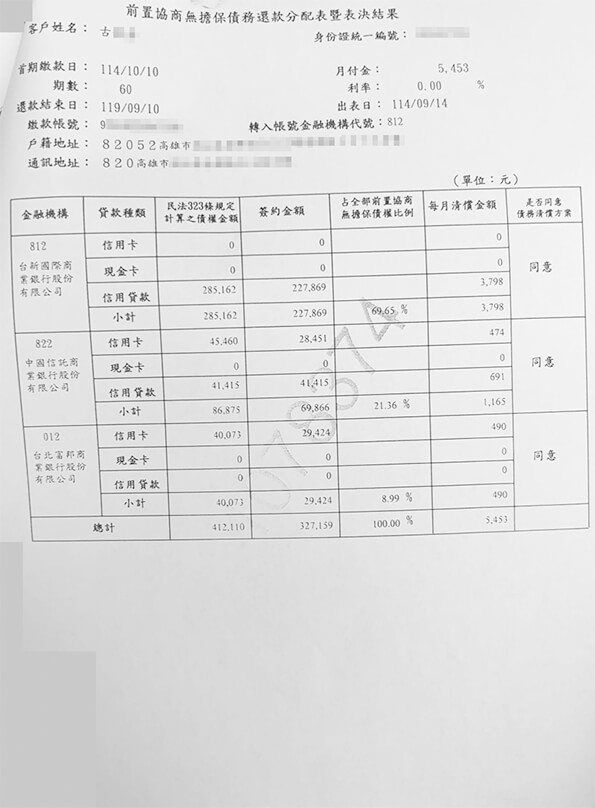 古小姐,現年26歲,職業為牙醫助理,平均月薪為新台幣2.5萬元,總債務為新台幣412110元,經鼎翰專業團隊協助處理後,協商方案為每1個月為一期,分60期清償,利率為0%,每期清償金額為新台幣5453元。