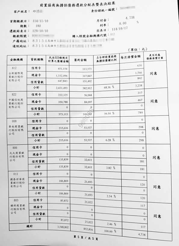 邱小姐,現年42歲,職業為早餐店店員,平均月薪為新台幣2萬元,總債務為新台幣3548802元,經鼎翰專業團隊協助處理後,協商方案為每1個月為一期,分180期清償,利率為0%,每期清償金額為新台幣4738元。