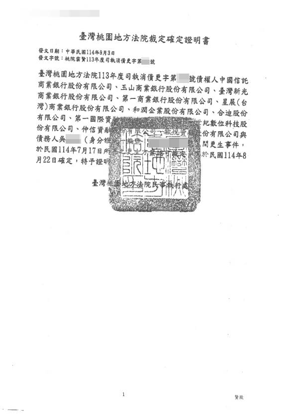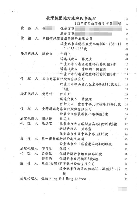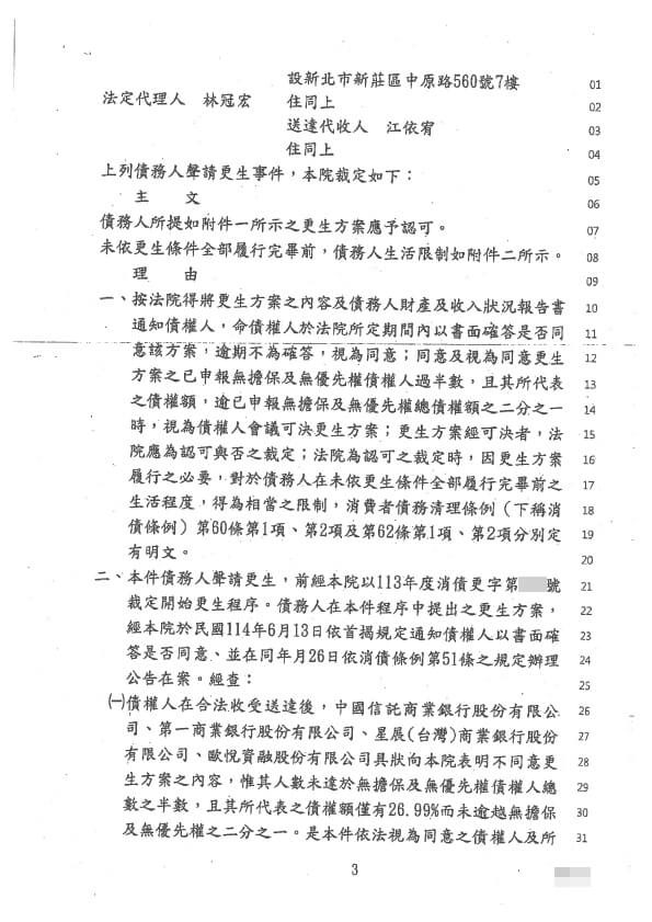 吳小姐,現年35歲,職業是美容業,平均每月收入42,000元,因為三個孩子陸續出生,為了讓孩子過更好的生活去借款,但物價連年上漲,收入實在不夠支出,導致無法正常繳款,債務累積高達2,620,865元,債務人依據消費者債務清理條例向臺灣桃園地方法院聲請更生程序,桃園地院依據其收入及生活必要支出費用,裁定以每1個月為1期,分6年,共72期,自更生方案認可確定之翌月起,第1期至第72期清償金額新台幣3,000元,總清償金額216,000元,總清償比例8.24%。