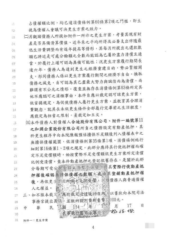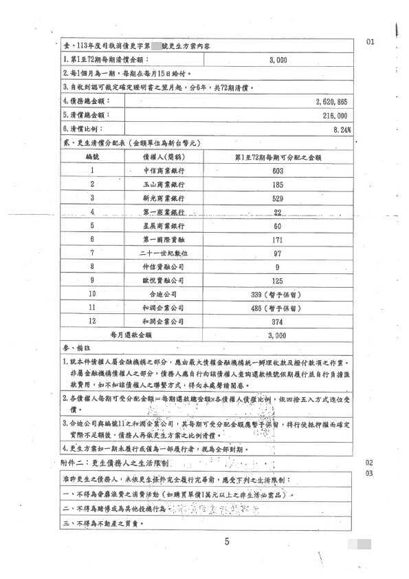 | 繳款期數:72期 (6年) | 裁定方案:月付3,000元 |