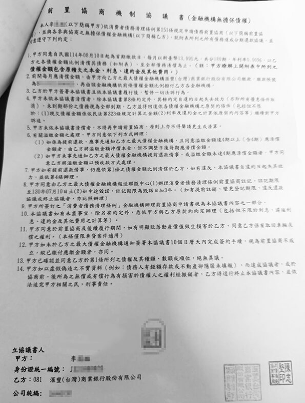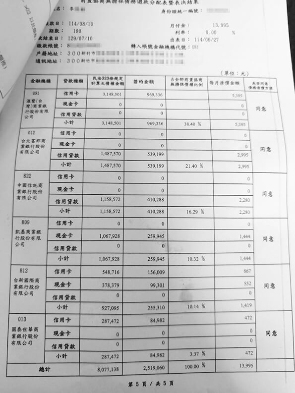 李小姐,現年47歲,職業為早餐店,平均月薪為新台幣2.5萬元,總債務為新台幣8077138元,經鼎翰專業團隊協助處理後,協商方案為每1個月為一期,分180期清償,利率為0%,每期清償金額為新台幣15000元。