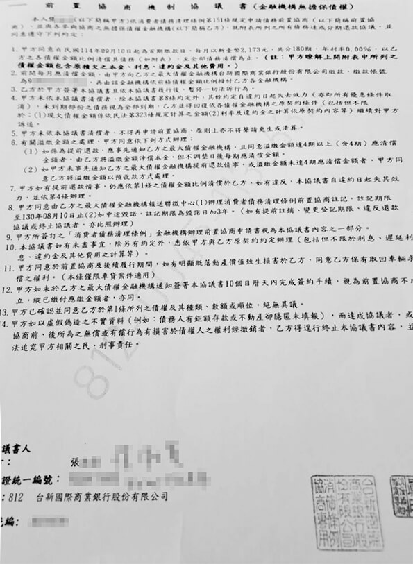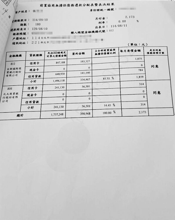 張小姐,現年67歲,職業為清潔工,平均月薪為新台幣2萬元,總債務為新台幣1737248元,經鼎翰專業團隊協助處理後,協商方案為每1個月為一期,分180期清償,利率為0%,每期清償金額為新台幣2173元。